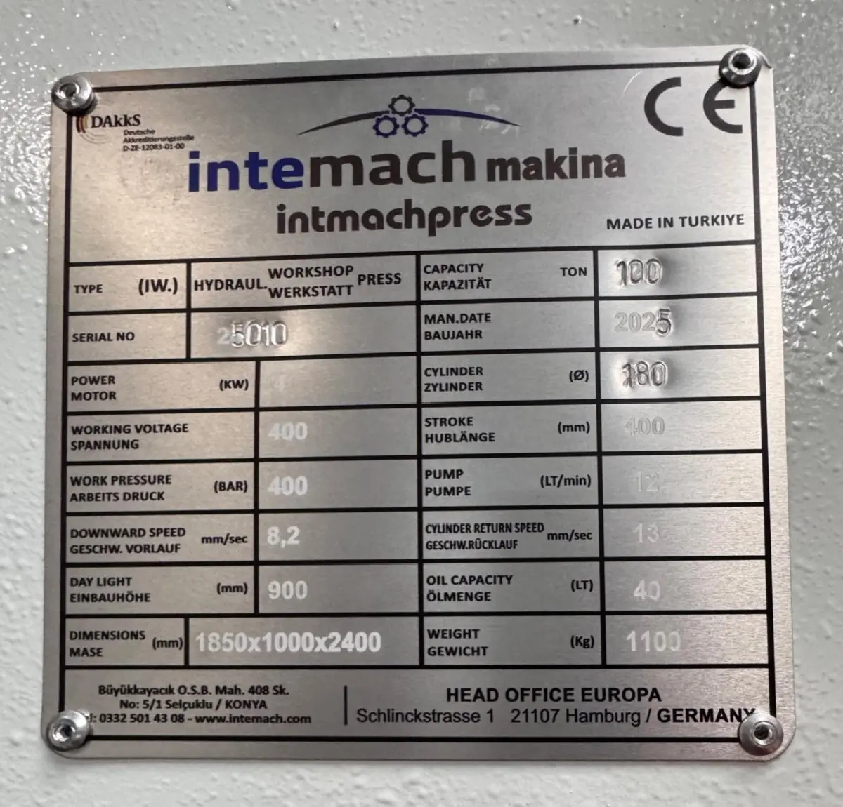 | Type of machine | IW. 100 Ton |
