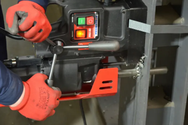 Der Bohrer und der Bedienerwerden durch die Magnetkraft-Adhäsionssteuermodul (MPAC) vor Arbeiten an zu dünnen Werkstücken geschützt. PRO-50