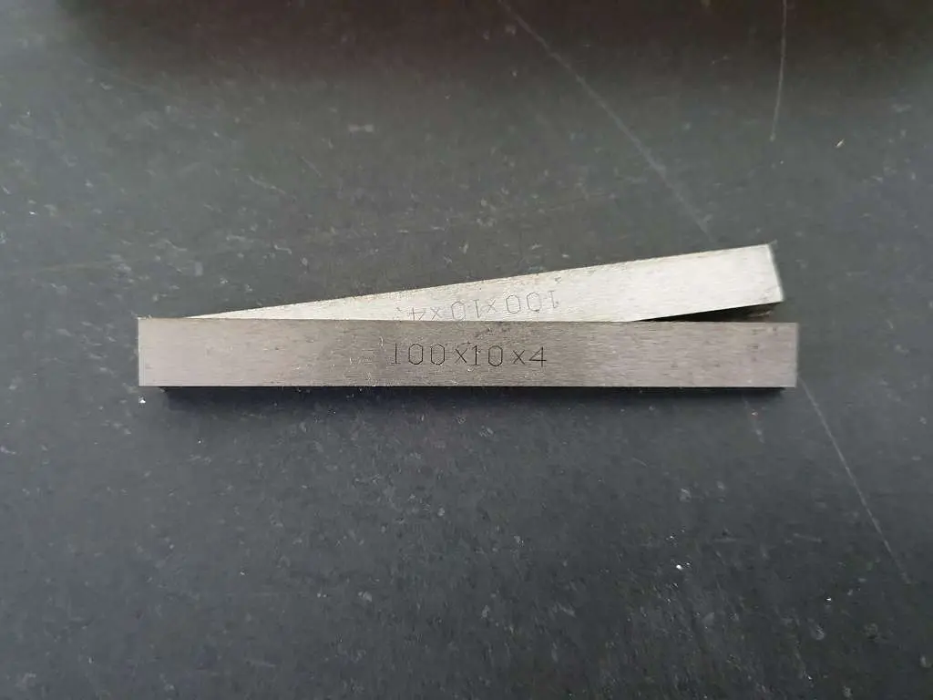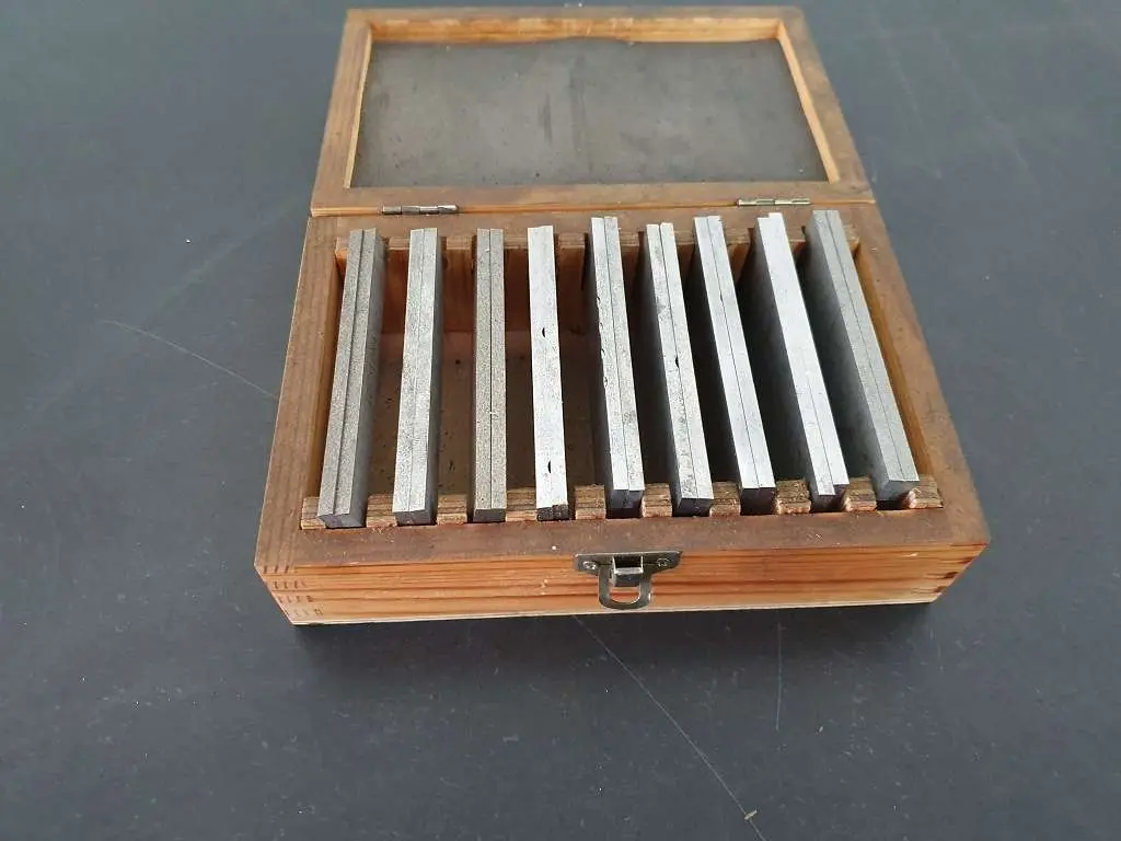 Höhen- und Paarungstoleranz 0,01 mm. Aufbewahrt in Holzbox. Härte: 60 HRC.