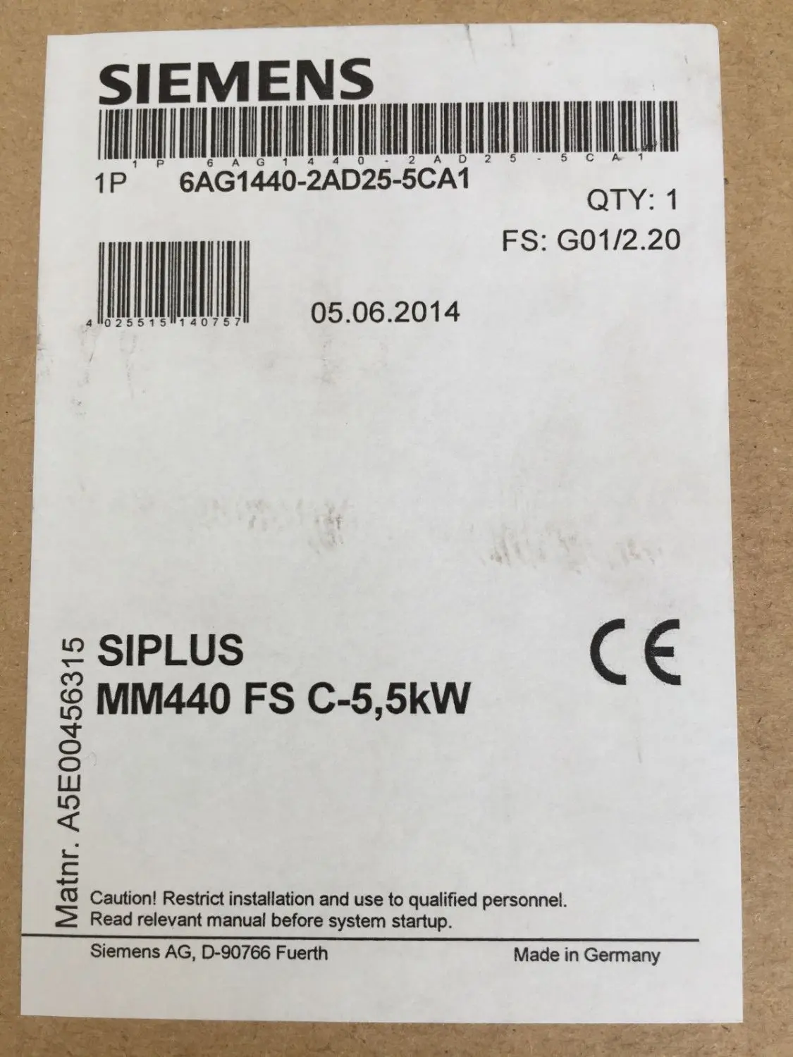 [EN] 1 pcs. new Siemens SIMATIC Siplus MM440 inverter FS C 5.5kW Micromaster 440 FOR MEDIAL STRESS BASED ON 6SE6440-2AD25-5CA1 in factory packaging ! E-Stand: G01/2.20