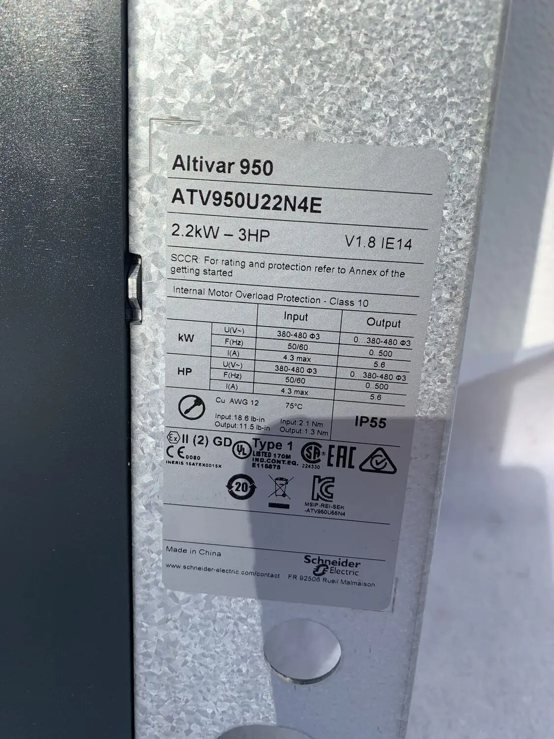 | الصانع | Artikel / Item: [DE] Zum Verkauf steht ein (1St.) neuer ATV950U22N4E Schneider Electric Altivar Prozess ATV900 Frequenzumrichter ATV950 2,2kW 400/480V. V1.8 IE14 |