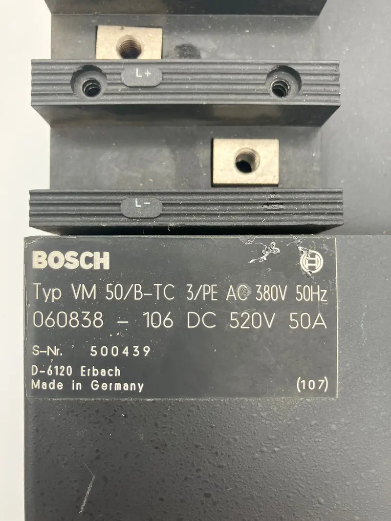 Zusatzinformation: Bosch Leistungsmodul mit der Nummer 060838-106, Eingang AC 380V 50Hz, Ausgang DC 520V 50A, Seriennummer 500439, geeignet für industrielle Antriebssysteme und CNC-Steuerungen