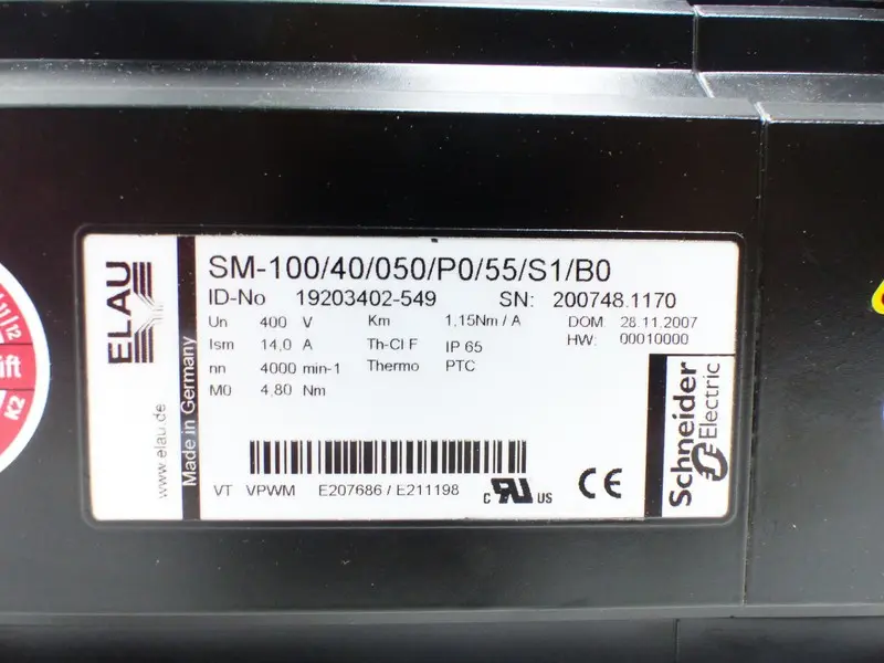 ELAU Servomotor SM-100/40/050/P0/55/S1/B0 400V 1,15Nm/A 14,0A TESTED UNUSED
