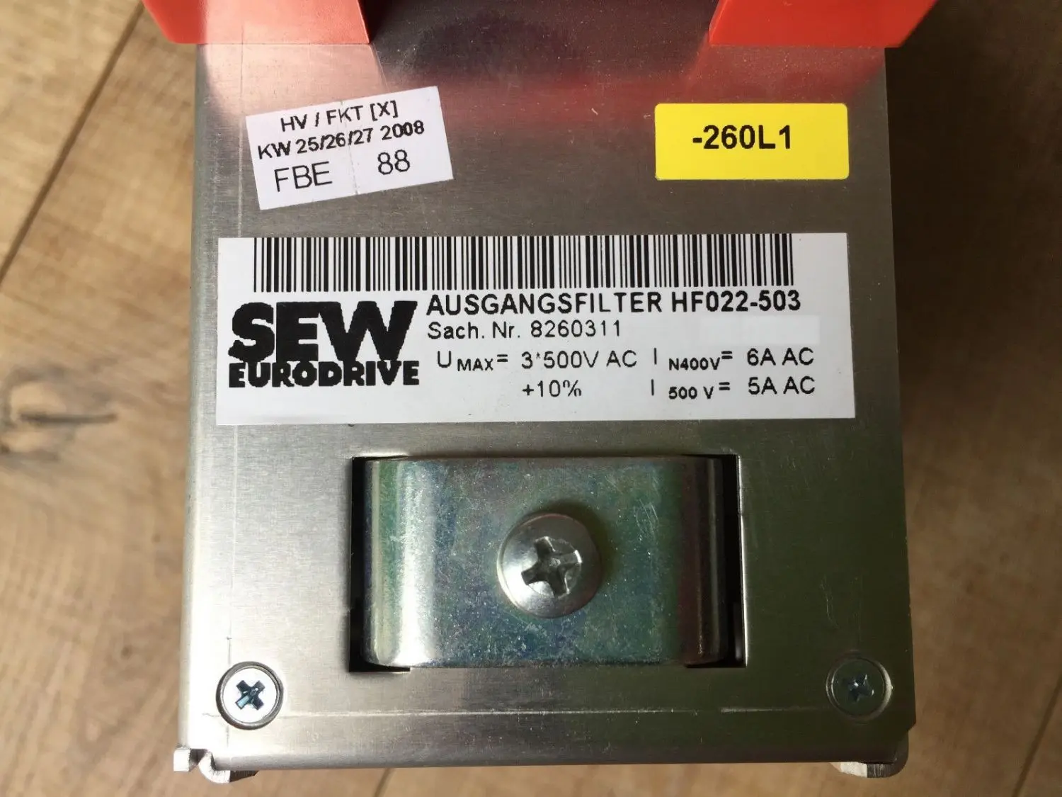 Output filters are used:- in group applications (several motor cables in parallel); the shifting currents in the motor cables are suppressed.- to protect the motor winding of non-SEW motors from overvoltage spikes, not designed for PWM-inverter operation.Rated voltage VN: 3 × 380 VAC -10% ... 3 × 500 VAC +10%, 50/60 HzVoltage drop in the filter (at rated current) ?V: < 6.5% (7.5%) bei 400 V / < 4% (5%) at 500 V at fAmax = 50 Hz (60 Hz)Rated through current (at Vin = 3 ×400 VAC) IN400V: 6 AACRated through current (at Vin = 3 ×500 VAC) IN500V: 5 AACAC leakage current at VN ?I: 0 mAPower loss at IN PLoss: 55 Wnterference emission via unshielded motor cables: according to class B limit to EN 55011 and EN 55014 complies with EN 50081, parts 1 and 2Ambient temperature ?amb: 0...+45°C reduction 3.0% IN per K up to max. 60°C)Enclosure: IP 20 (EN 60529)Terminals: terminal studs M4: 0.5...6 mm2 (AWG 20...10)Weight: 4.4 kg (9.70 lb)