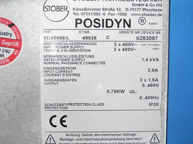 سيرفو Stöber Posidyn Servo Drive SDS5008/L 0,75kW + ASP5001/1 DP5000 TESTED
